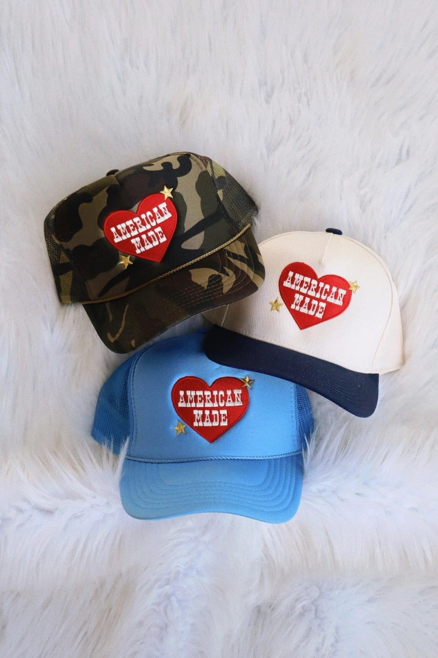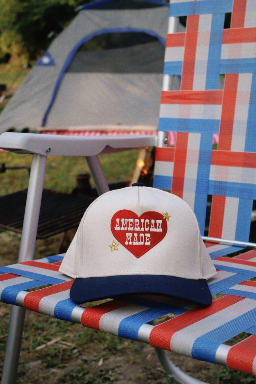 American Made embroidered hat, detailed with red heart, ivory text, metallic gold stars, and an optional USA flag on the left!
