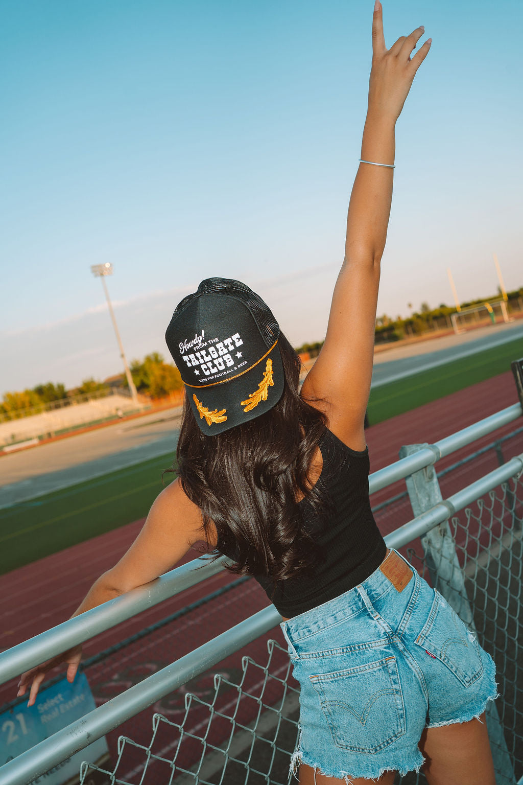 Customizable, high crown foam trucker hat our newest Howdy From the Tailgate Club - Here for Football & Beer design! Each hat is one size fits most and detailed with adjustable snap backing.