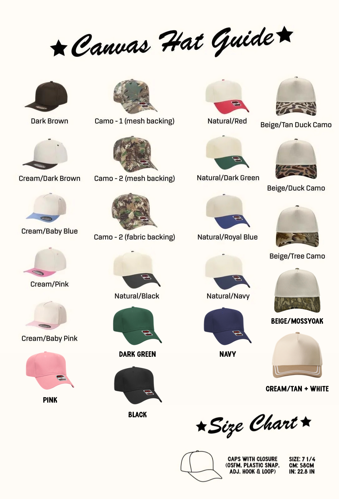 - Select your hat type, foam or canvas, as pricing is different. Please refer to the listing images for hat type, hat color, and thread color guides! Please enter the hat and thread color you'd like in the personalization box below.