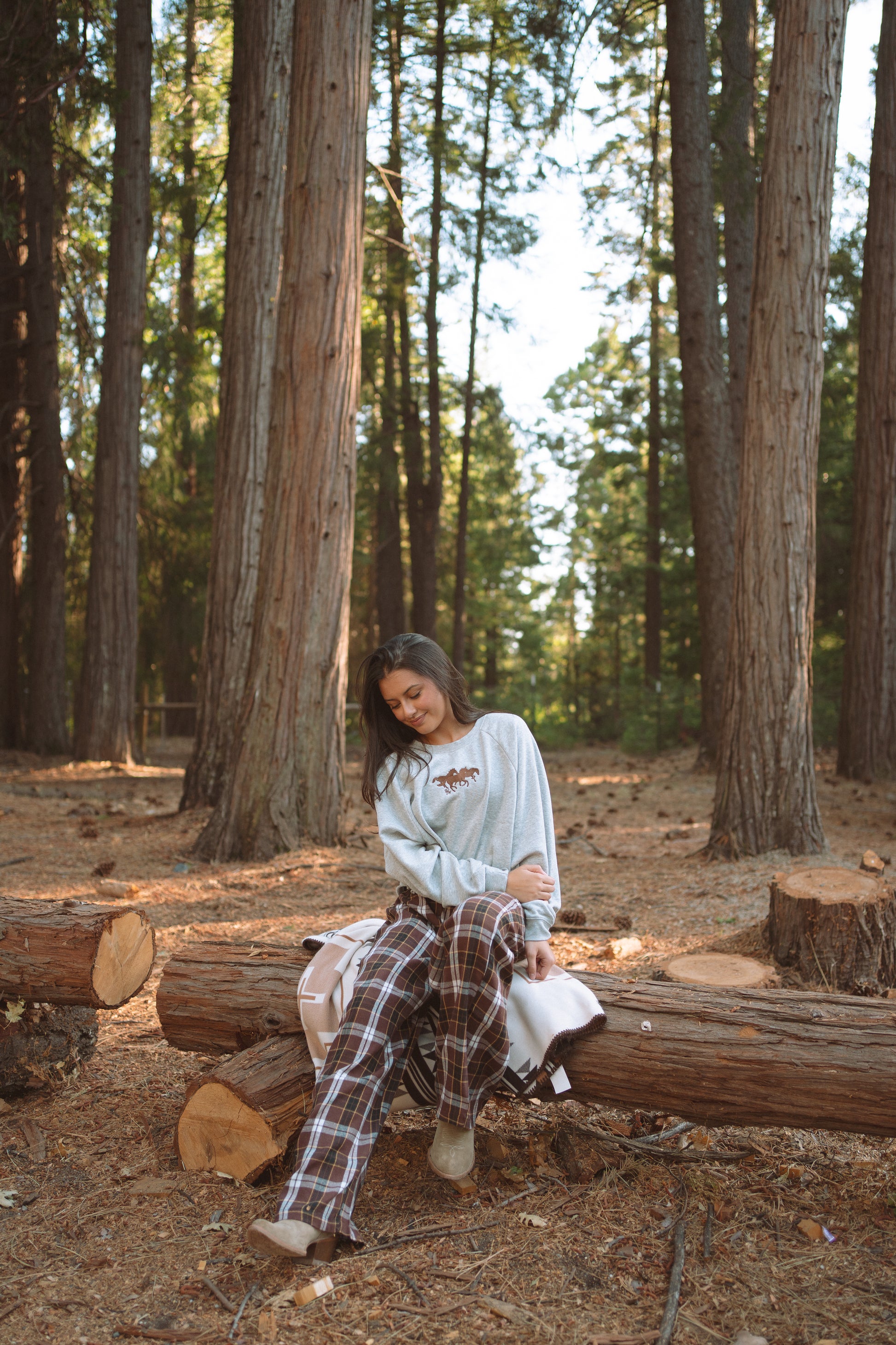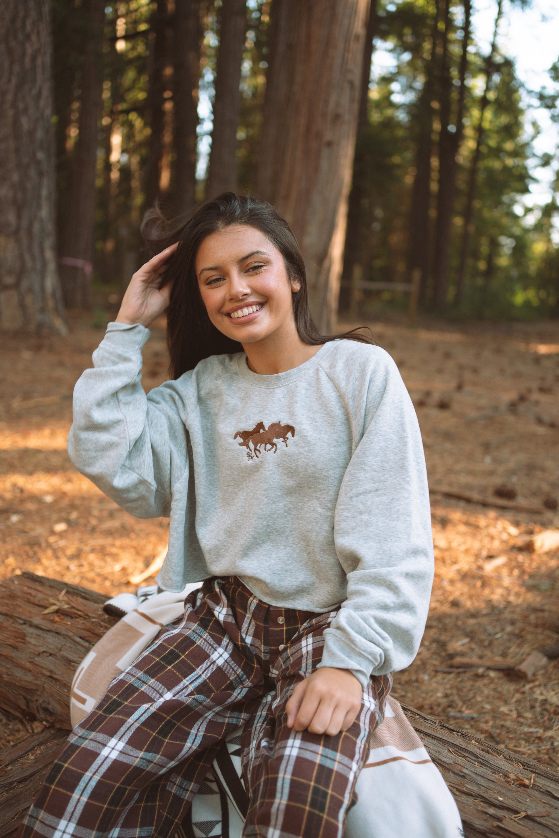 Butter soft gray fleece cropped crewneck detailed with our "Wild Horses" embroidered design in brown. Fits true to size with oversized drop shoulder.
