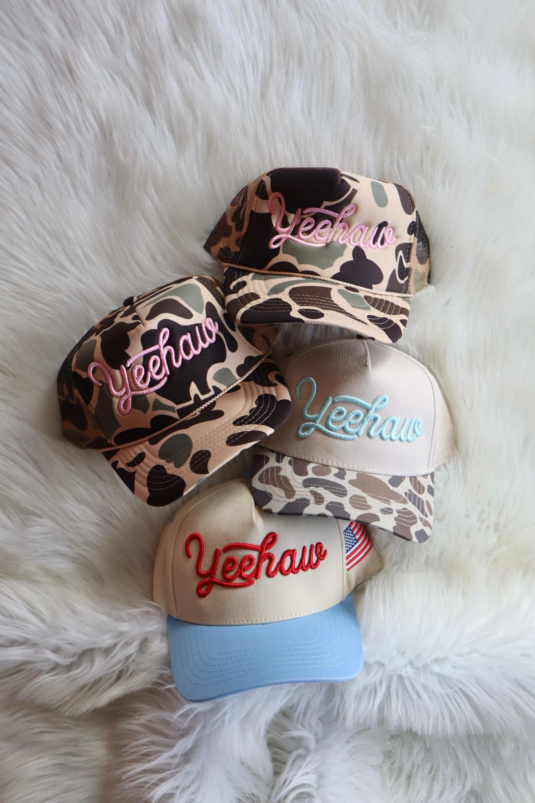 - Cream/Light Blue + Red Thread (bottom hat) - no imperfections, made on incorrect hat color